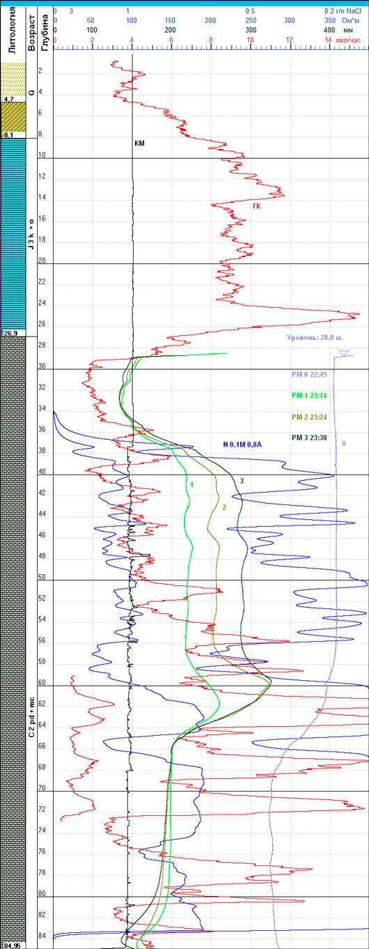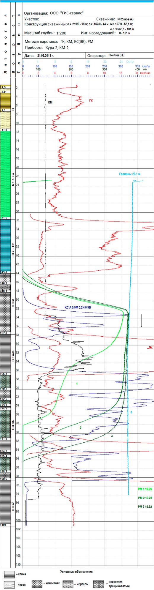 ГК – (гамма-каротаж, мкр/час) – метод измерения естественной радиоактивности пород, применяется для расчленения разреза и выявления аномалий; ЭК – (электрокаротаж, Ом/м) – метод расчленения разреза по электросопротивлению; КМ – (кавернометрия, мм) – измерение диаметра скважины для оценки ее технического состояния; РМ – (резистивиметрия) – измерение удельного сопротивления промывочной жидкости, применяется для качественной и количественной оценки динамических процессов в скважине, действующих на данный момент времени под влиянием естественных и искусственных перепадов давления жидкости. Для оценки дебита скважины без ее внешнего возбуждения использование данных РМ недостоверно..
