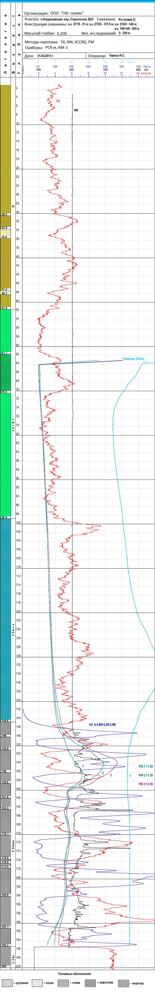 ГК – (гамма-каротаж, мкр/час) – метод измерения естественной радиоактивности пород, применяется для расчленения разреза и выявления аномалий; ЭК – (электрокаротаж, Ом/м) – метод расчленения разреза по электросопротивлению; КМ – (кавернометрия, мм) – измерение диаметра скважины для оценки ее технического состояния; РМ – (резистивиметрия) – измерение удельного сопротивления промывочной жидкости, применяется для качественной и количественной оценки динамических процессов в скважине, действующих на данный момент времени под влиянием естественных и искусственных перепадов давления жидкости. Для оценки дебита скважины без ее внешнего возбуждения использование данных РМ недостоверно..